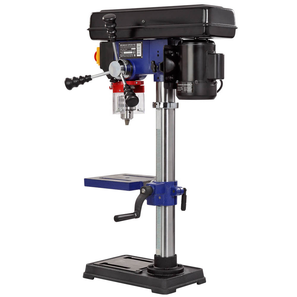Станок предназначен для обработки различных материалов вращающимся режущим или шлифующим инструментом, с целью получения сквозных или глухих отверстий, растачивания, зенкерования. Модель DP250-16J простая, но обладает целым рядом достоинств. Стол, опора и корпус сверлильной головки выполнены из чугуна, что придает оборудованию серьезный вес 29 килограмм. Двигатель асинхронный, мощностью 450 Вт. Станок высокий – 855 мм, подходит для обработки заготовок большой толщины. Максимальное расстояние между шпинделем и столом – 430 мм.