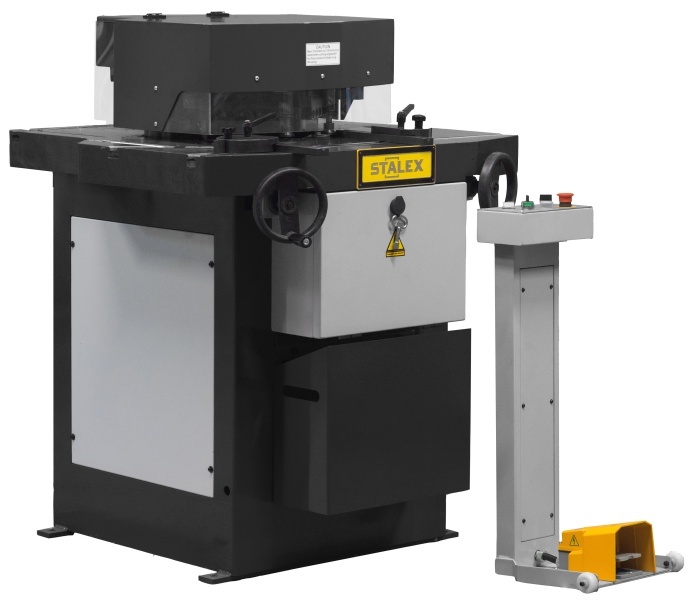 Особенности угловысечного станка Stalex HNM-6A - это мощное оборудование с гидравлическим приводом ножей для вырубки углов от 30° до 140° в листовом металле толщиной до 6 мм. Станок может работать в режиме гильотины и резать листы металла шириной до 200 мм. Процесс резки происходит за счёт работы гидроцилиндра, перемещающего узел по двум направляющим колоннам.