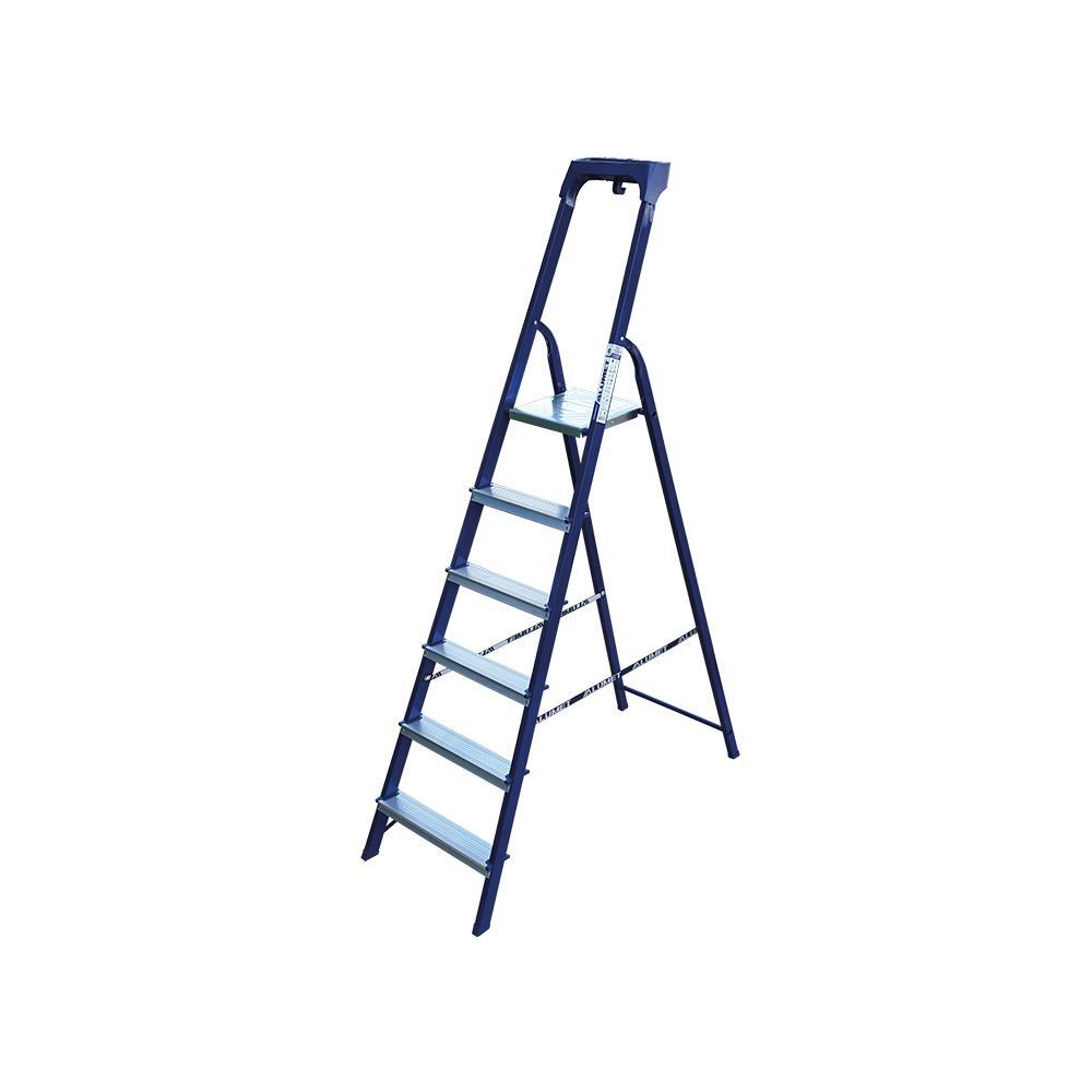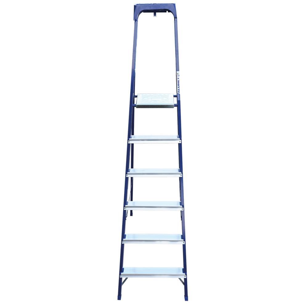 Стремянка Алюмет стальная с пластиковым органайзером представляет собой свободностоящую переносную лестницу, сужающуюся к верху, имеющую сторону подъема (переднюю ногу), опорную сторону (заднюю ногу), рабочую площадку и раскладывающуюся для выполнения определённой задачи. Дуга безопасности конструктивно выполнена совместно со стороной подъема.