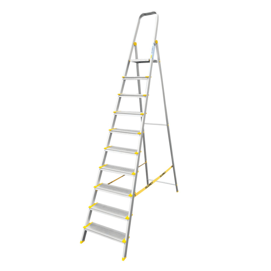 Стремянка Алюмет алюминиевая 10 ступеней (AS710) профессиональная с анодированным покрытием серии АS предназначена для проведения различных видов работ на не большой высоте, как в быту, так и на производстве. Максимальная рабочая нагрузка - 250кг. Стремянка отличается высокой прочностью, небольшим весом и устойчивостью к воздействию коррозии.