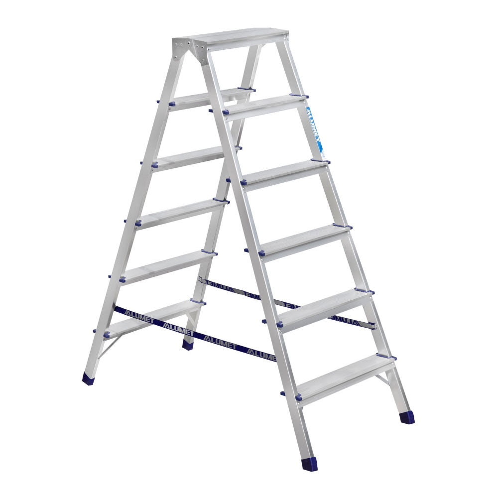 Двусторонняя алюминиевая стремянка Алюмет с 6 ступенями предназначена для работы на высоте до 3,33 м. Алюминиевый толстый профиль значительно облегчает конструкцию. Рельефные ступеньки шириной 51 см обеспечивают надежное сцепление с подошвой.