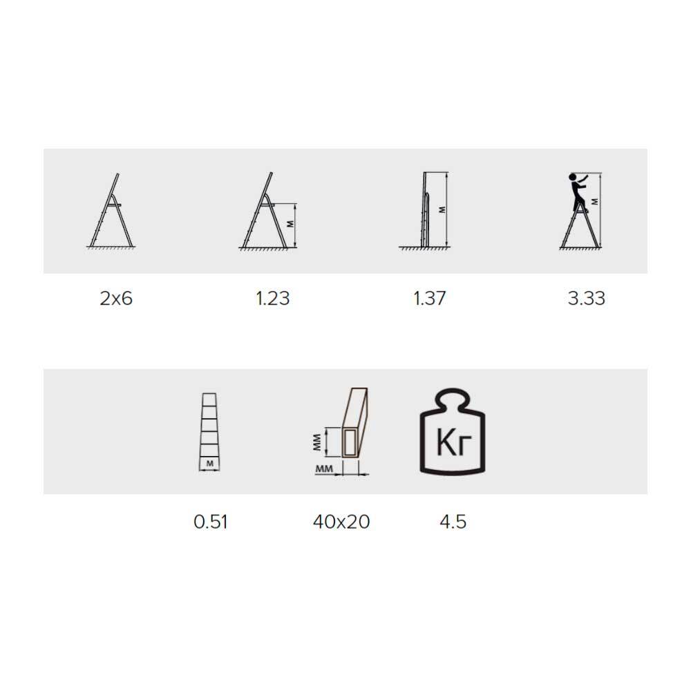 Площадка расположена на высоте 1,23 м. Лестница фиксируется в рабочем положении страховочными ремнями. Башмаки из твердого пластика защищают основание от царапин и вмятин. Максимальная допустимая нагрузка — 150 кг.