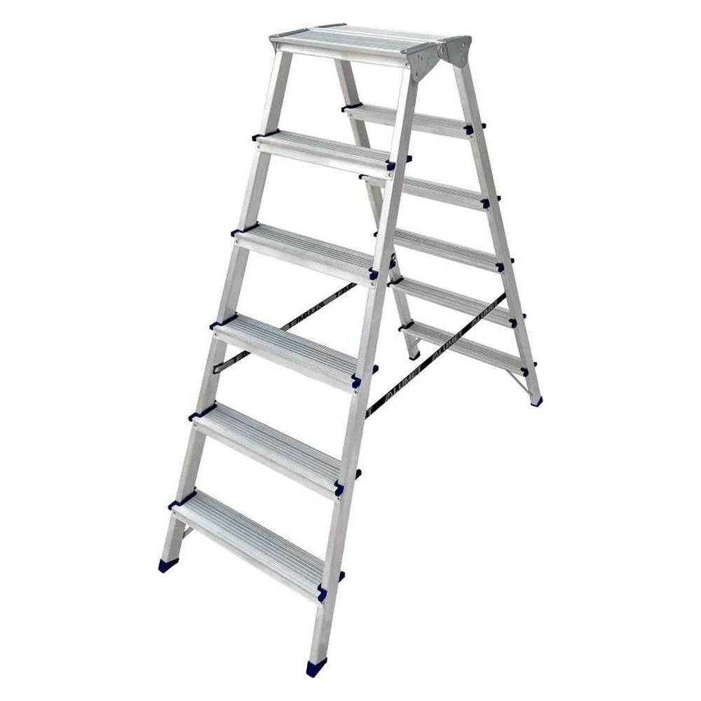 Стремянка алюминиевая Алюмет двухсекционная (ADK6206) представляет собой свободностоящую переносную лестницу, сужающуюся к верху, имеющую две стороны для подъема на высоту. Складная стремянка — ваш надежный помощник на производстве, в быту, идеальное решение для дома, офиса и сада. Ширина верхних ступеней увеличена до 130мм и образуют верхнюю рабочую площадку - 260мм. Тетива и ступени изготовлены из высокопрочного алюминиевого сплава. Башмаки изготовлены из высокопрочного пластика. Стремянка фиксируется двумя страховочными ремнями. В сложенном виде имеет компактные размеры.