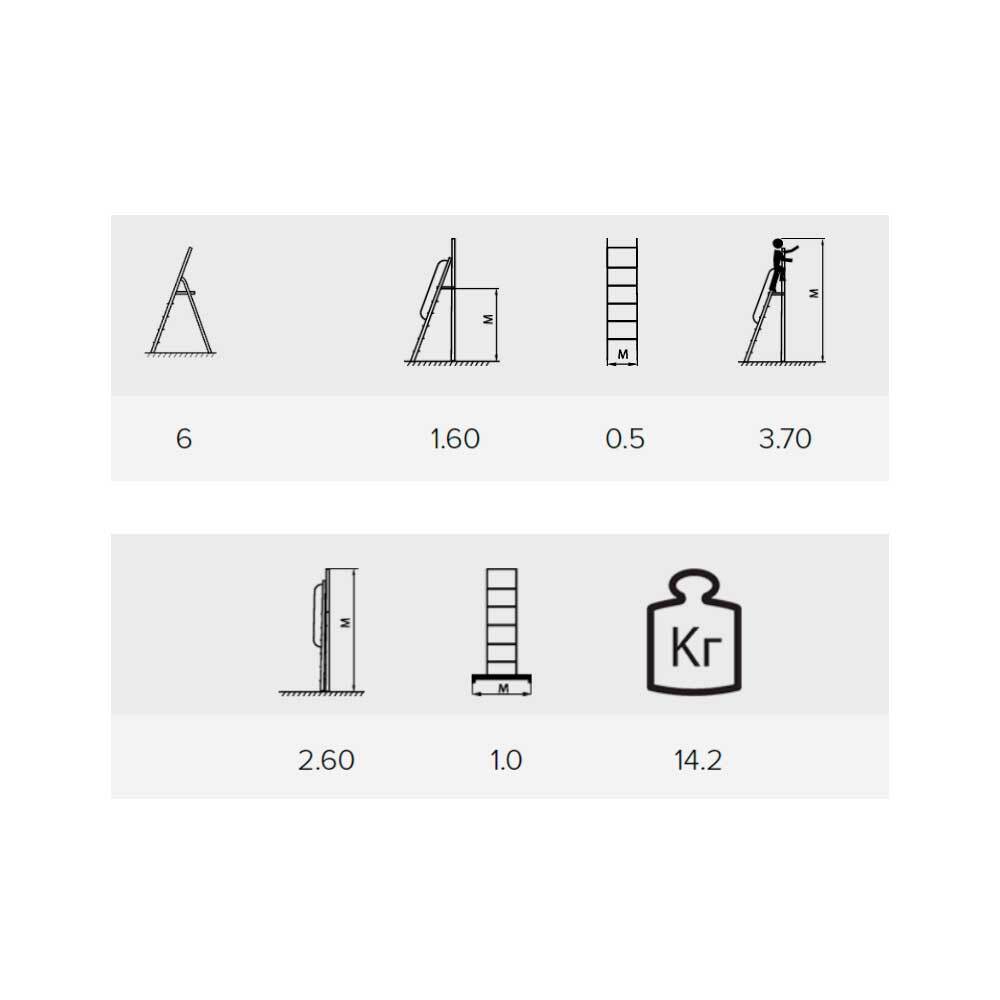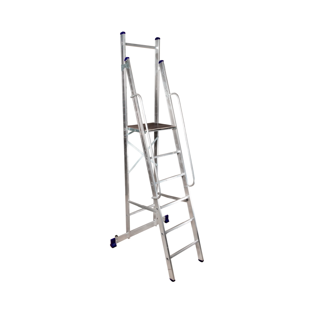 Площадка из влагостойкой и нескользящей фанеры расположена на высоте 1,60 м. Стабилизатор шириной 1 м обеспечивает устойчивость конструкции. Башмаки сделаны из твердого пластика, предотвращающего появление царапин и вмятин на покрытии. Максимальная статическая нагрузка на лестницу — 150 кг.