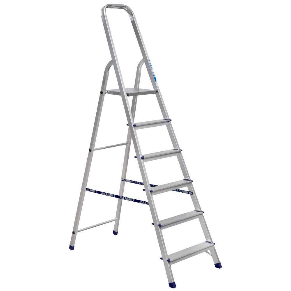 Стремянка Алюмет 6 ступени двухсторонняя алюминиевая выполнена из прочного материала, который позволяет вам без труда переносить ее по строительной площадке. Безопасная, устойчивая и надежная, она станет отличным помощником в вашей работе и хозяйстве. Материал изготовления позволяет говорить о максимальной устойчивости и прочности конструкции. С ней могут работать даже люди тяжелой весовой категории.