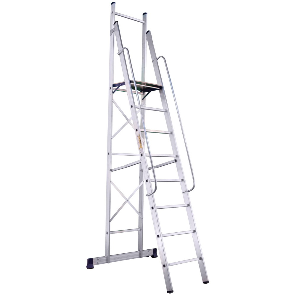 Лестница фиксируется металлическими распорками и платформой. Площадка из влагостойкой и нескользящей фанеры расположена на высоте 2,12 м. Стабилизатор шириной 1 м с колесами позволяет легко перемещать лестницу по стройплощадке. Башмаки из твердого пластика не царапают основание. Допустимая статическая нагрузка — 150 кг.