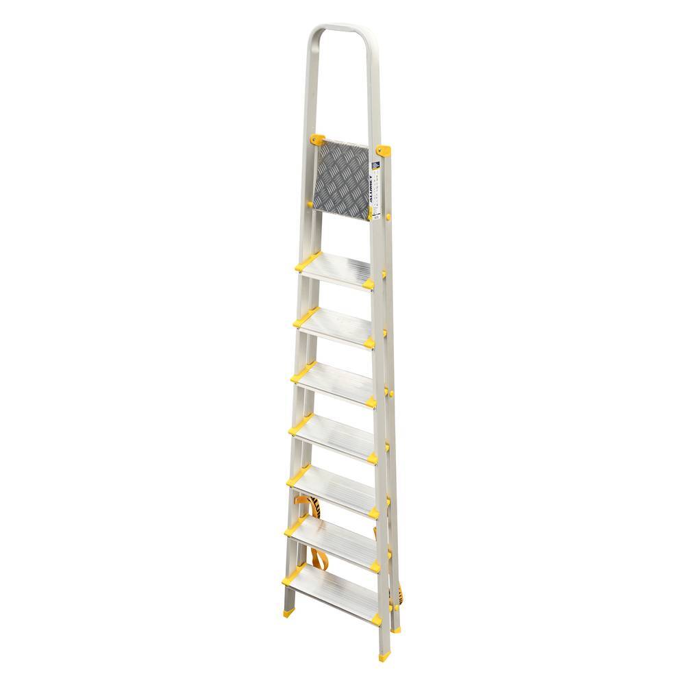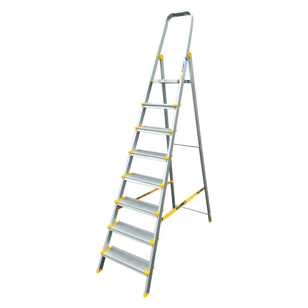 Стремянка алюминиевая Алюмет односекционная 8 ступеней (AS708) представляет собой переносную конструкцию с 8 ступенями шириной 130мм, предназначенную для работы на высоте. Конструкция оснащена дугой безопасности, имеет противоскользящие опоры из прочного пластика, выдерживает нагрузку до 250кг. Общая длина стремянки составляет 2.47 м, высота площадки – 1.66 м, рабочая – 3.76 м.