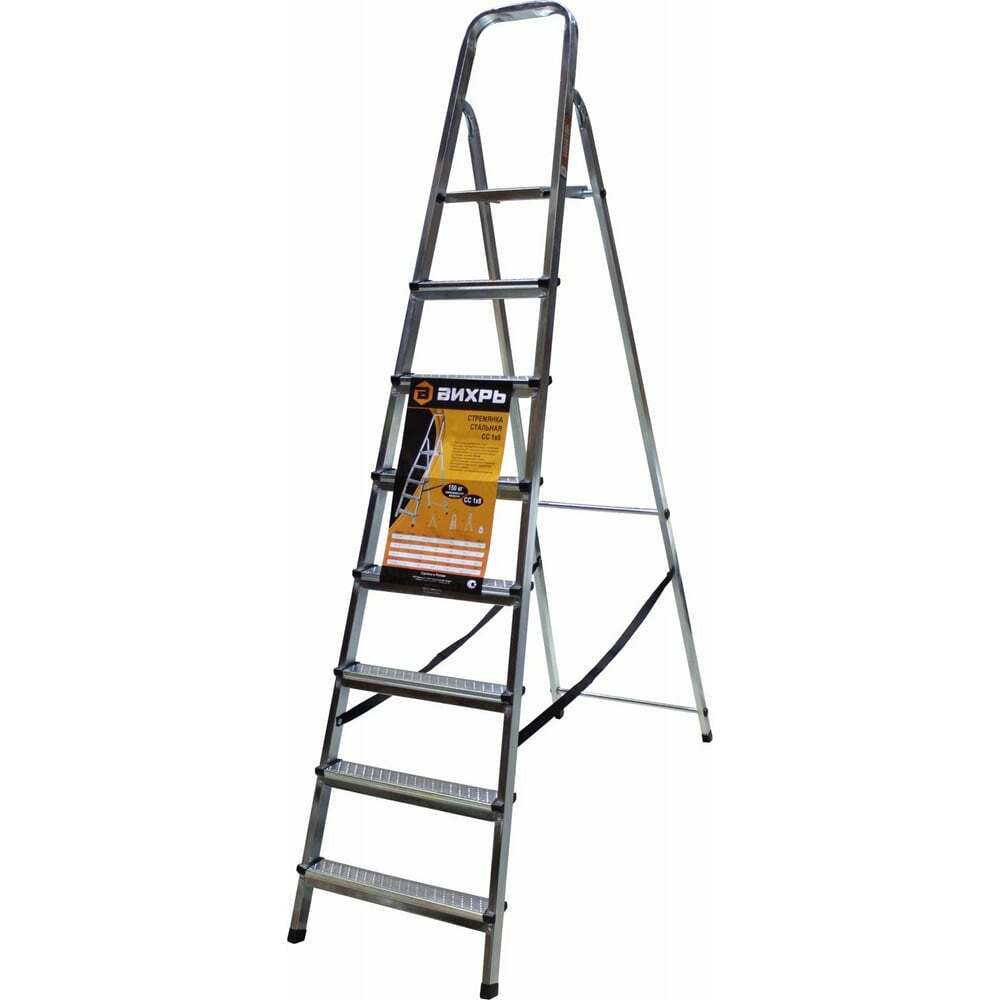 Стремянка алюминиевая ВИХРЬ СА 1х8 широко применяется в быту. Корпус изготовлен из алюминия, что облегчает транспортировку. Односекционная модель с широкими ступенями с рифленой поверхностью и рабочей площадкой. Чтобы стремянка не скользила, на опорах оборудованы заглушки. Также есть дуга безопасности. В сложенном состоянии модель очень компактна и занимает мало места.