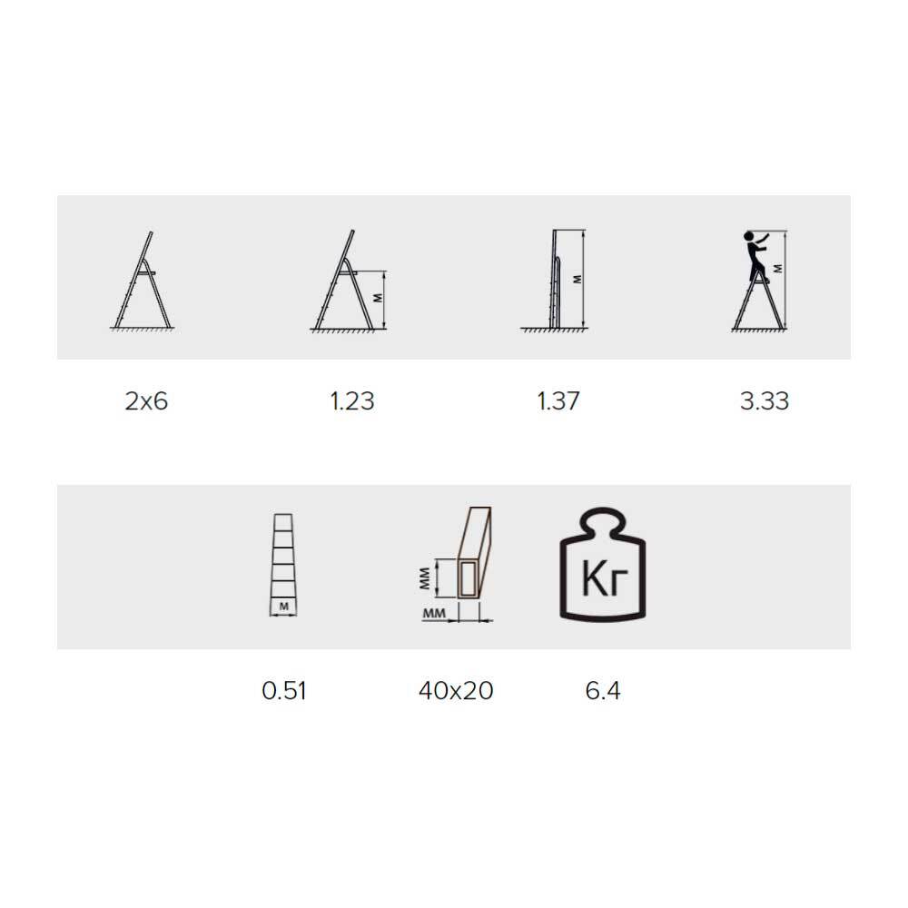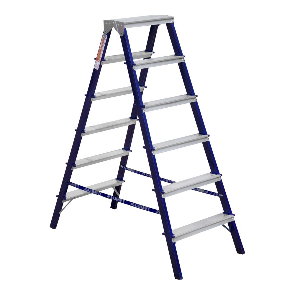 Двухсторонняя стальная стремянка Алюмет MD 8206 с 6 ступенями предназначена для работы на высоте до 3,4 м. Стальной облегченный профиль покрыт порошковой краской для защиты от коррозии. Ступеньки шириной 51 см сделаны из рифленого алюминиевого профиля, что не позволяет ноге соскользнуть.
