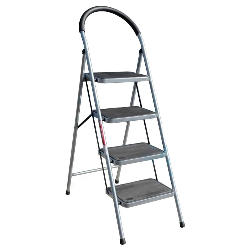 Стальная стремянка Алюмет MCH 204 с 4 широкими ступенями предназначена для работы на высоте до 2,7 м. Лестница фиксируется платформой. Дополнительные ребра жесткости на одной из опор делают конструкцию прочной. Резиновая накладка на дуге предотвращает соскальзывание рук.