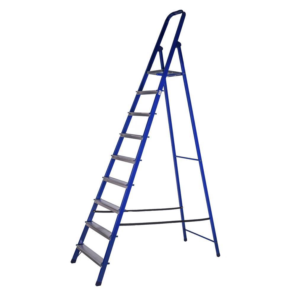 Стремянка стальная STAIRS односекционная с алюминиевыми ступенями 9 ступеней CS09 это универсальная и простая в использовании стремянка, которая подойдет как для бытовых задач, так и для ремонта. Каркас изготовлен из стали, которая обеспечивает надежность, прочность и усиливает устойчивость конструкции. Сталь покрыта порошковой краской, которая защищает изделие от коррозии.