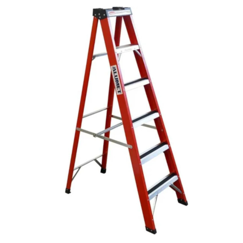 Стремянка стеклопластиковая Алюмет односекционная 5 ступеней (SF 1005) - представляет собой свободностоящую переносную лестницу. Конструкция имеет одну сторону подъема, раскладывается для подъема на высоту, фиксируется двумя страховочными стальными планками. Стремянка оснащена эргономичным, пластиковым органайзером для инструментов, имеются отверстия под инструменты и лотки для метизов (или мелких деталей). Лестница оснащена противоскользящими заглушками, выполненными из высокопрочного пластика, что повышает устойчивость конструкции и безопасность. Тетивы выполнены из П-образного профиля (из стеклопластика), ступени стремянки - из высокопрочного алюминиевого профиля. Ступени имеют противоскользящую рифленую поверхность (по центру проходит наждачная лента). Конструкция обеспечивает надежное крепление ступеней к тетивам с помощью заклепок.