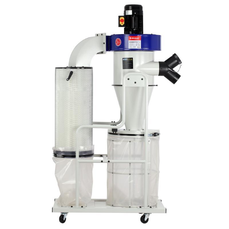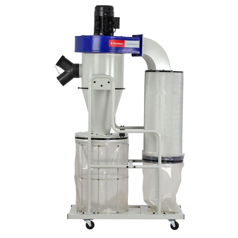 Вытяжная установка BELMASH CTDC-1.2 предназначена для удаления древесных опилок, стружки и пыли, образующихся в процессе деревообработки. Рассчитана на подключение к сети 230 В. Мощность 2200 Вт. Сначала воздух с большой скоростью тангенциально подается внутрь цилиндрической части корпуса циклона. Под воздействием центробежной силы крупные частицы отбрасываются к стенкам, а затем вниз – в коническую часть аппарата. Оттуда отходы попадают в большой стружкосборник. Это первая ступень очистки. Затем воздух поступает в фильтр-картридж, где за счет прохождения потока через фильтрующий элемент с большой площадью поверхности (3,5 кв. м) происходит окончательная очистка. Мелкие частицы собираются в малом мешке, который крепится под фильтром. Это вторая ступень очистки. Очистка фильтра проходит ручным способом, при вращении рукоятки осевшие частицы стряхиваются вниз.
