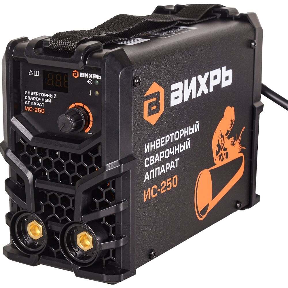 Если нужен универсальный, портативный сварочный аппарат, то модель Вихрь ИС-250 может стать лучшим выбором. Он относится к категории инверторных сварочных аппаратов и позволяет проводить любой ремонт, где нужна мобильность и небольшая мощность с высоким качеством сварочных работ. Аппарат работает от сети с параметрами 140-250В, 50Гц. КПД – 80%. Сварочный ток регулируется в пределах 15-250А.Вихрь ИС-250 позволяет проводить работы в ручном режиме с одним электродом. Для удобства и повышения качества работ в сварочном аппарате реализованы функции: уменьшения сварочного тока в случае «залипания» электрода – Antistick, повышение тока в начале сварки – Hot Start и регулируемого форсажа дуги для её устойчивости. Агрегат имеет удобные органы управления и систему охлаждения. В комплектацию аппарата входят 2 кабеля: с клеммой заземления и с электрододержателем. Производитель допускает эксплуатацию сварочного аппарата в температурном диапазоне от -20 до +50С. Степень пыле- и влагозащиты – IP21. Вес агрегата – 3.8 кг. Гарантия – 1 год.