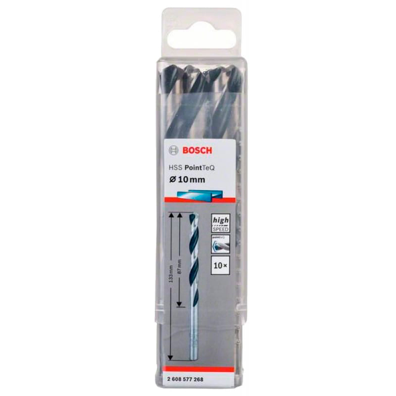 Сверло по металлу Bosch PointTeQ 10x133мм 10шт (268) не требует накернивания. Снабжено цилиндрическим хвостовиком и предназначено для работы с дрелями-шуруповертами и сверлильными стойками. Угол заточки наконечника – 135 градусов.