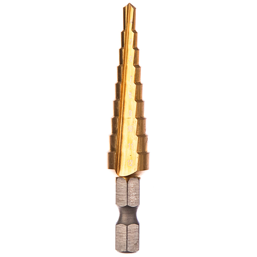Сверло по металлу Makita HSS-TiN 4-12мм ступенчатое (D-40113) с прямым желобком и титановым покрытием предназначено для сверления отверстий различного диаметра в нелегированной стали, нержавеющей стали, алюминии, чугуне, стали с пределом прочности до 800 Н/мм².