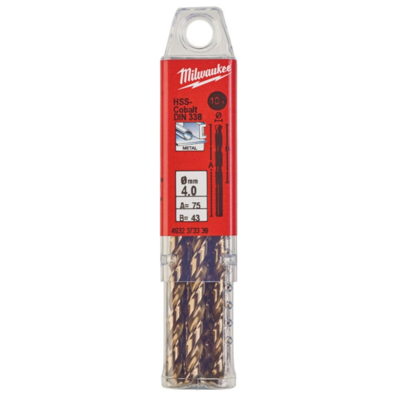 Сверло по металлу Milwaukee HSS-CO 4х75мм 10шт (339) из прочной и устойчивой к нагреву быстрорежущей стали с 5% добавлением кобальта. Применяется для сверления высоколегированных сталей и металлов с пределом прочности на разрыв свыше 1000 Н/мм², например, нержавеющая сталь.
