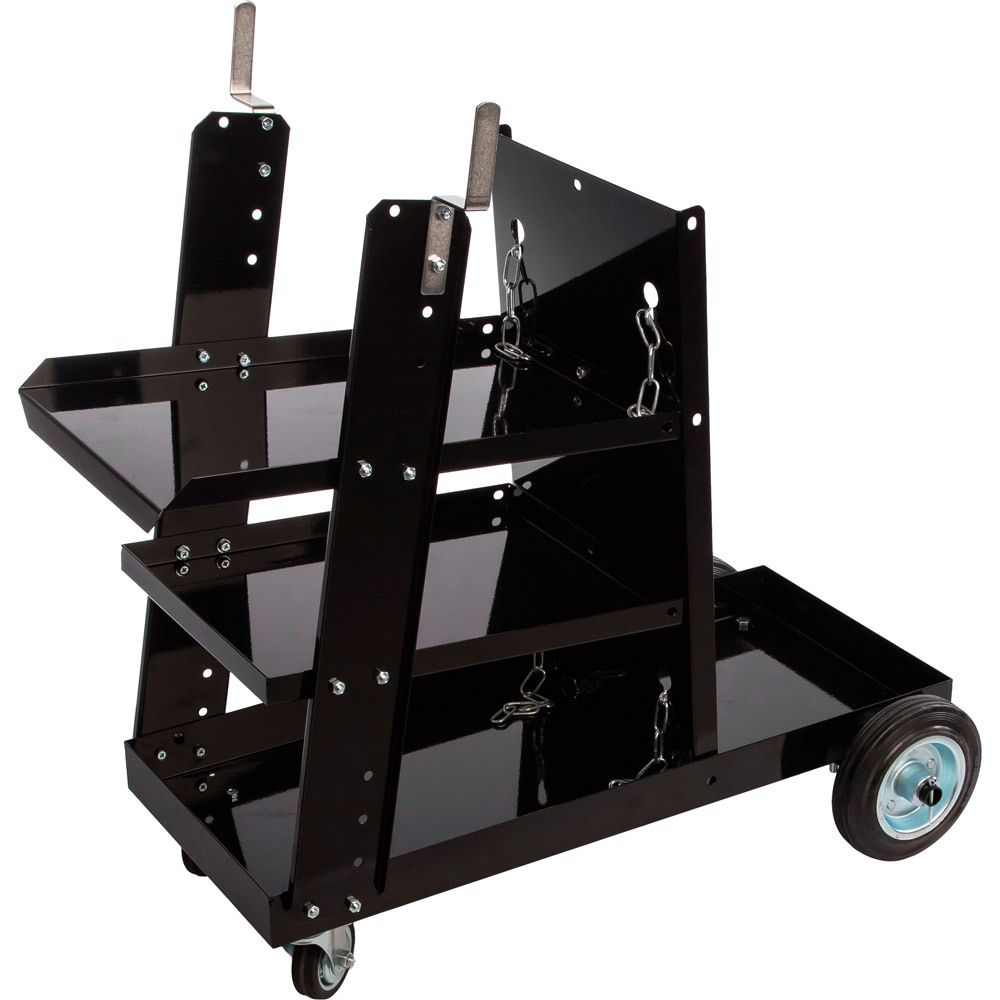 Тележка AuroraPRO предназначена для перевозки сварочного аппарата и баллонов с газом по стройплощадкам, цехам и гаражам. Стол для аппарата расположен на высоте 75 см, что позволяет настраивать оборудование, не наклоняясь к нему. Размер платформы 28×45 см позволяет разместить сварочники AuroraPro для MIG/MAG и TIG сварки, а также агрегаты серии Plasma.