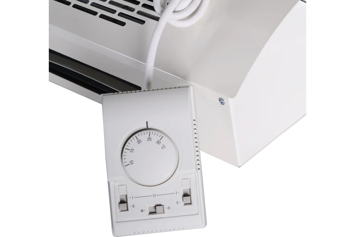 У тепловой завесы 3 режима работы: без нагрева, нагрев в половину мощности 3 кВт и полный 6 кВт. Спиральные стич-элементы моментально прогревают входящий воздух. Вентилятор дует со скоростью 7,9 м/с, пропуская через игольчатый нагреватель до 780 м³ воздуха в час. При срабатывании защиты от перегрева автоматика отключает стич-элементы, продолжая обдув холодным воздухом для их быстрого охлаждения. С помощью пульта ДУ можно задать температуру в помещении от 10 до 30 градусов, она будет поддерживаться автоматически.
