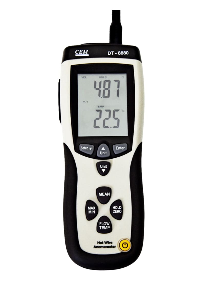 Анемометр CEM DT-8880 — это компактное цифровое устройство. Его используют для получения замеров минимальных скоростей движений воздуха. Также он пригодится для получения данных или контроля параметров вентиляционных систем и систем кондиционирования.