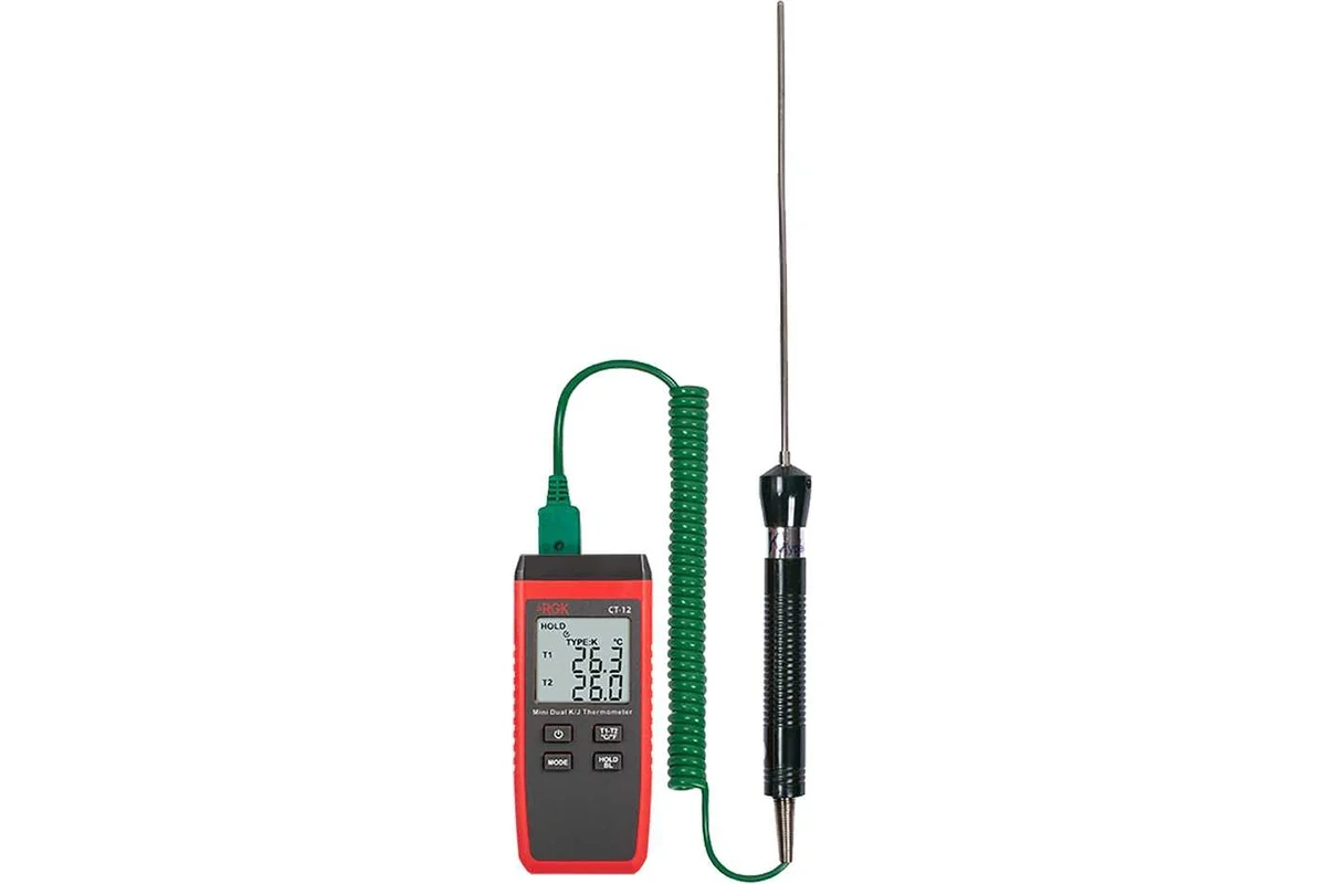 Контактный термометр RGK CT-12 с погружным зондом температуры TR-10W с поверкой - это надежный и точный прибор для измерения температуры в диапазоне от -40°С до +400°С с комплектной термопарой. Погрешность при этом составляет не более ± 1,5 °C. Главное преимущество этой модели - 2 гнезда для подключения выносных датчиков с функцией определения разности между каналами. Благодаря такой конфигурации можно быстро и удобно решать множество измерительных задач, связанных с диагностикой и настройкой электроники, промышленного оборудования, систем отопления и вентиляции т.п. При подключении более продвинутых моделей термопар и зондов рабочий диапазон контактного термометра расширяется до - 50 °С — + 1300 °С, что позволяет рекомендовать устройство в т.ч. и для профессионального применения. За счет небольшого веса компактный двухканальный цифровой термометр RGK CT-12 с погружным зондом температуры TR-10W с поверкой удобен для проведения длительных инспекций в полевых условиях, легко помещается в карман одежды или сумки. С большого дисплея показания считываются легко и без путаницы между каналами. Корпус прибора выполнен из прочного пластика, снабжен рельефными участками для надежного захвата и выдерживает падение с метровой высоты. Специальная индикация оповещает специалиста о ненадлежащем подключении или неисправности выносного датчика. Устройство также сообщает о превышении предела измерений и низком уровне заряда элементов питания.