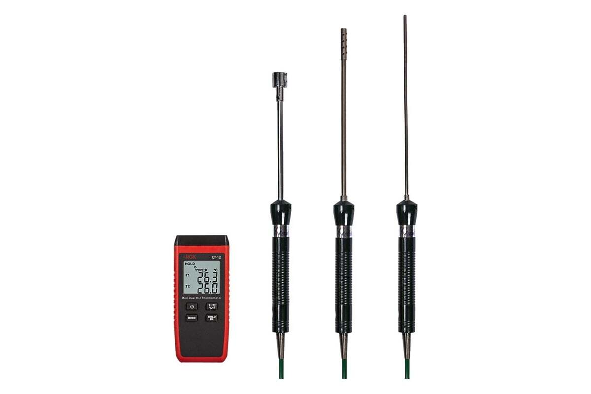 Контактный термометр RGK CT-12 с зондом температуры воздуха TR-10A, поверхностным зондом TR-10S и погружным зондом температуры TR-10W с поверкой - это надежный и точный прибор для измерения температуры в диапазоне от -40°С до +500°С с комплектной термопарой. Погрешность при этом составляет не более ± 1,5 °C. Главное преимущество этой модели - 2 гнезда для подключения выносных датчиков с функцией определения разности между каналами. Благодаря такой конфигурации можно быстро и удобно решать множество измерительных задач, связанных с диагностикой и настройкой электроники, промышленного оборудования, систем отопления и вентиляции т.п.