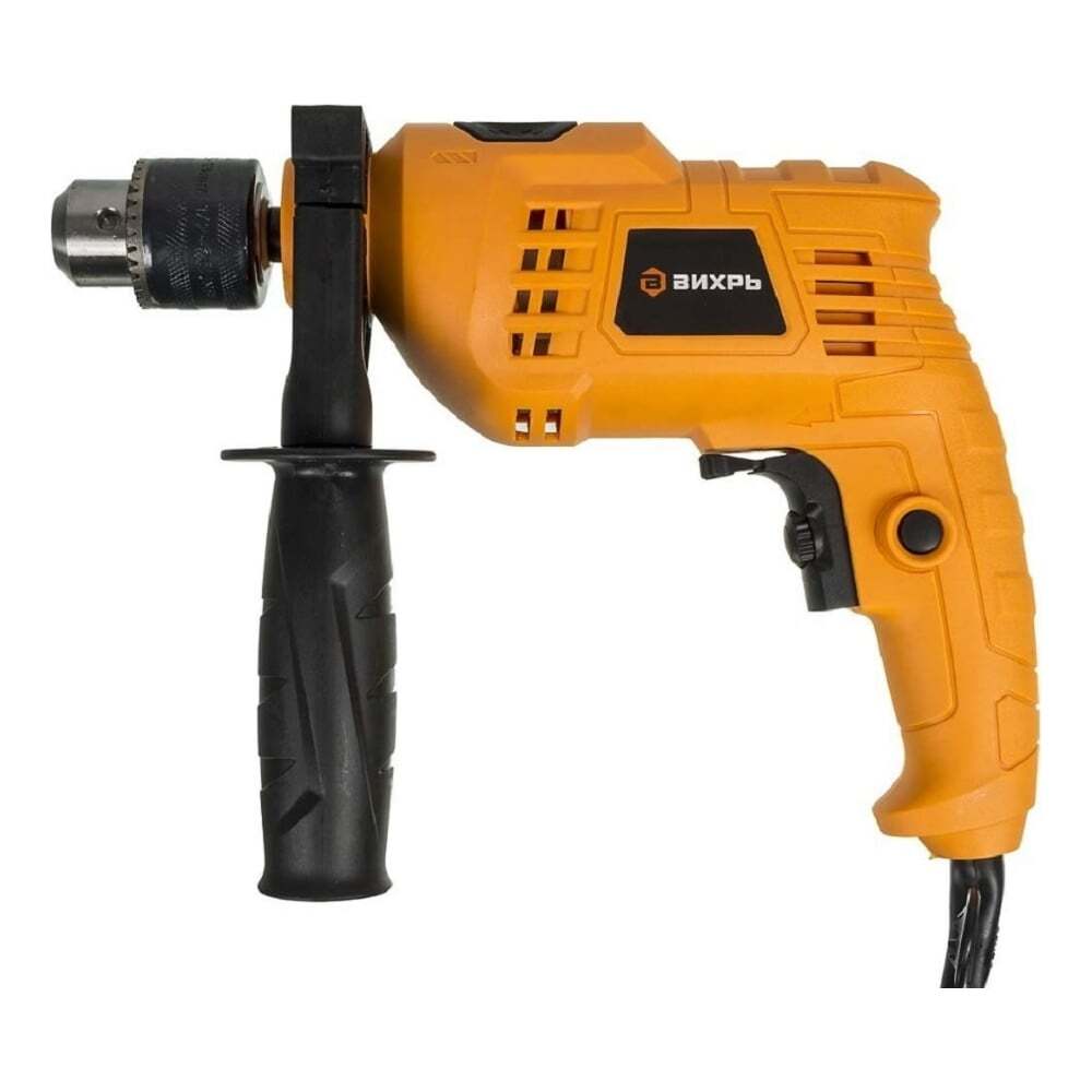 Компактная ударная дрель модели Вихрь ДУ-500 – строительный электроинструмент, который предназначен для создания отверстий в материалах разной твердости: стали и других металлах, древесине и бетоне. Максимальный диаметр сверления этих материалов составляет 10,25 и 13 мм соответственно. Электродрель незаменима при ремонте в частных домах и квартирах, поскольку позволяет не только сверлить отверстия, но и быстро закручивать винты и шурупы, а также выкручивать их при демонтаже мебели и других конструкций. Такую возможность обеспечивает реверсивный режим вращения сверла. Частота вращения составляет до 3000 оборотов в минуту. Дрель Вихрь ДУ-500 с 1-скоростным редуктором обладает номинальной мощностью 500 Вт. Она удобна в использовании, поскольку оснащена кнопкой-фиксатором. Нажав её, оператор может не зажимать кнопку включения во время работы. Это обеспечивает комфорт даже при длительном использовании. Кнопка включения электродрели чувствительна к силе нажатия, от неё зависит скорость вращения сверла. Инструмент дополнительно оснащён регулировщиком глубины сверления, благодаря которому легко сделать одинаковые отверстия нужного размера.
