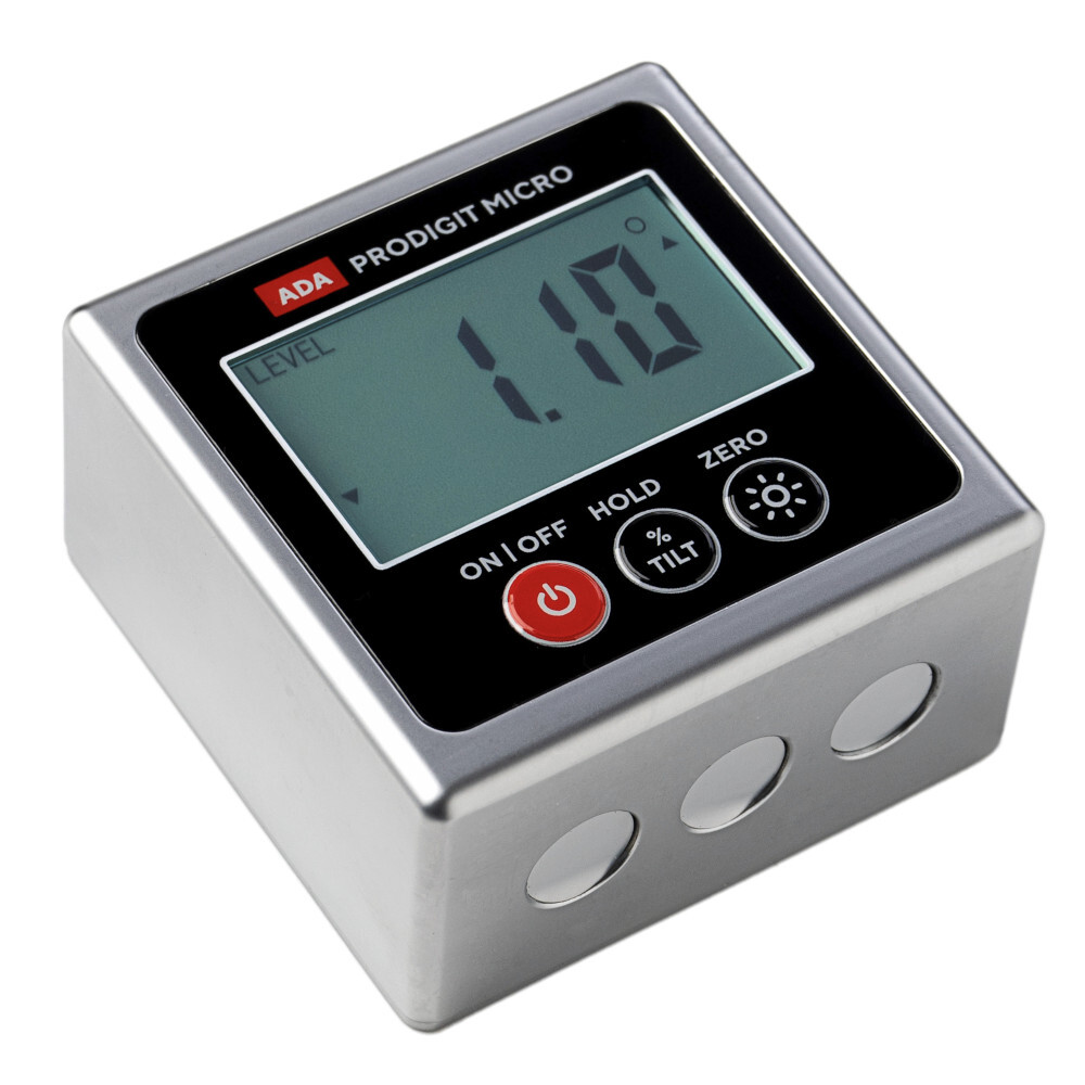 Угломер электронный ADA Pro-Digit MICRO позволяет быстро и точно определить угол отклонения поверхности от горизонта или вертикали. Достаточно установить прибор на поверхность или прикрепить к вертикальной конструкции, и он покажет на дисплее не только угол отклонения, но и его «направление». Для работы в затемненных местах есть подсветка экрана с результатами. Для измерения относительных углов (между двумя произвольно выбранными поверхностями, например между рабочим столом и диском торцовочной пилы) есть специальный режим. Корпус прибора выполнен из лёгкого и прочного алюминиевого сплава, рабочая поверхность оснащена магнитами, что позволяет легко крепить и определять уклон стальных конструкций. Благодаря малому весу и размерам он не займет много места. Может использоваться для выравнивания торцовочных пил, установку направляющих для ГКЛ, установки подвесных потолков, столярных работы и т. д.