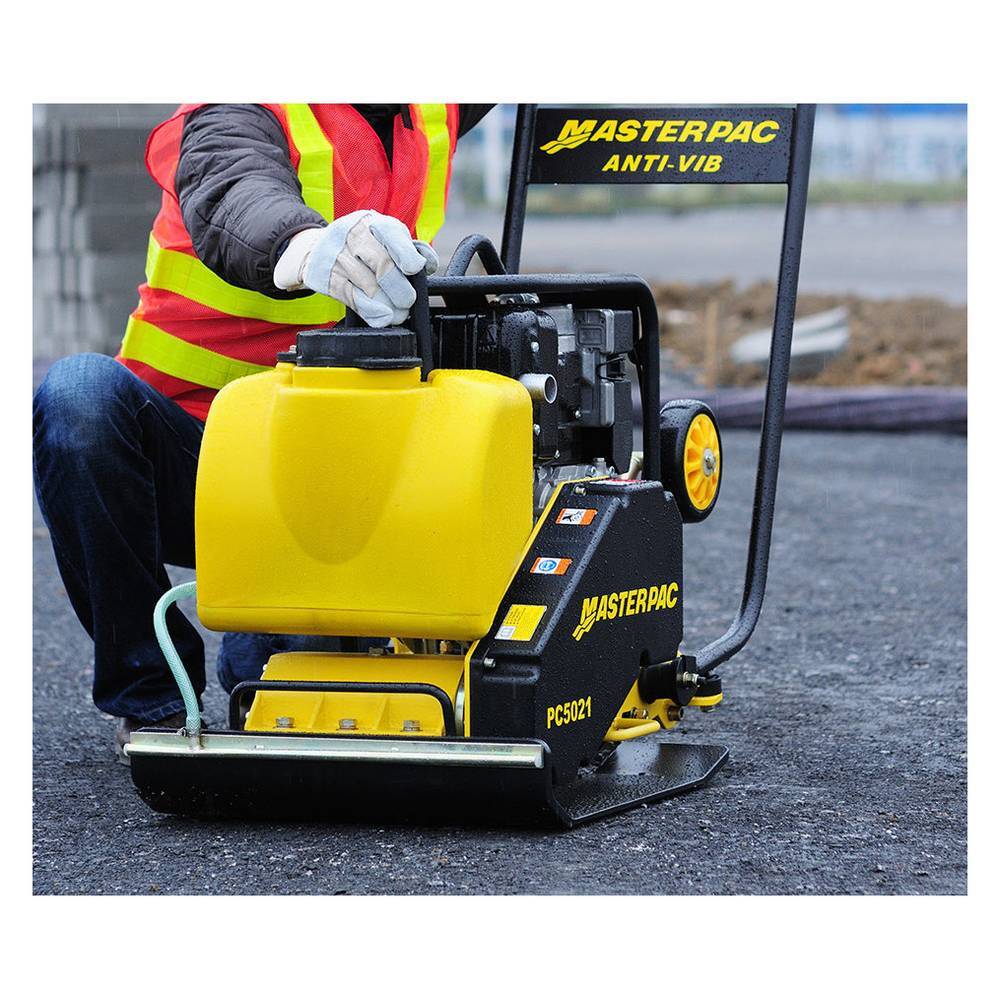 Виброплита MASTERPAC PC5021H.2 - технологичная и достаточно мощная виброплита прямоходного типа в категории свыше 100кг. Сухой вес машины 115кг. Энергоемкий редуктор настроен на частоту 90 Гц с центробежной силой 21кН. Параметры оборудования позволяют качественно уплотнять песчано-щебневые насыпи, отсев, крошку. Глубина трамбования примерно 300-400мм. Как опцию на модель можно докупить систему смачивания с водяным баком. Это позволит эффективно работать по горячему асфальту. Также как опция поставляются колеса. Данная модель комплектуется мотором Honda GX160. Этот двигатель широко распространен на виброплитах до 150кг. Мощности 5.5л.с. с запасом хватает для уверенной тяги на песчаных поверхностях. При движении по свежеуложенному асфальту скорость достигает до 22м/мин. При учете ширины стального основания 500 мм машина имеет показатель производительности до 660м2 за 1 час.