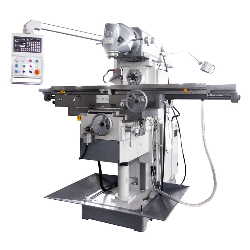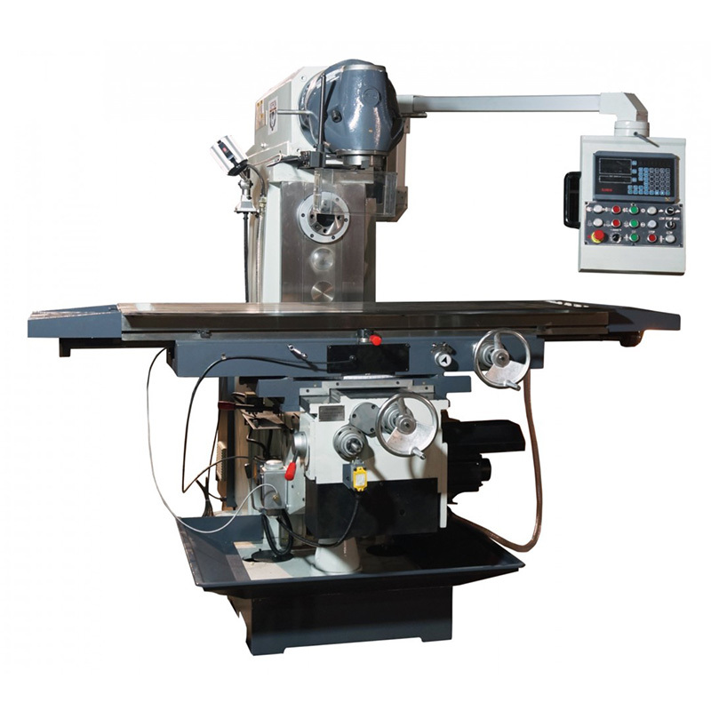 Особенности модели – ускоренное перемещение по трем осям, автоматические вертикальная, продольная и поперечная подачи стола, увеличивающие производительность и расширяют удобство использования. Станок оснащен горизонтальным и мощным, неподвижным вертикальным шпинделем, способными работать на разных скоростях для выполнения различных операций. В любой шпиндель можно установить сверлильный или цанговый патрон и обрабатывать материалы различной твердости. Так же можно работать с торцевыми и концевыми фрезами разных размеров и нарезать резьбу. Фрезерную головку можно поворачивать вправо и влево на определенный угол в двух плоскостях. Удобная функция – возможность изменять её вылет по оси «Y».