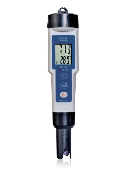 Влагозащищенный pH метр DT-176 — компактный прибор для замеров уровня кислотности (в диапазоне от 0 до 14 pH) и температуры в жидкостных средах.