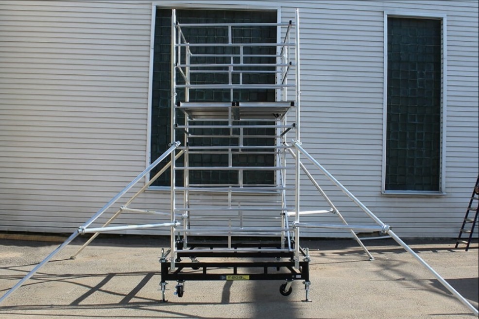 Вышка модульная алюминиевая MEGAL ВМА 1400/22 предназначена для организации рабочего места на высоте с использованием лестничных маршей в строительно-монтажных, ремонтных и прочих работах. Вышка собирается из двухметровых и метровых вертикальных рам. Рамы стыкуются между собой и фиксируются крепежными скобами. Все ступени рам выполнены из рифленого профиля, что обеспечивает безопасный подъем. Используются диагональные и горизонтальные связи (стяжки). Рабочий настил размером 2,0 х 1,4 м с люком. Вышка монтируется на усиленном широком основании. Мобильность вышки достигается за счет поворотных колес со стопорами. Опорная поверхность на домкратах, исключая колеса.