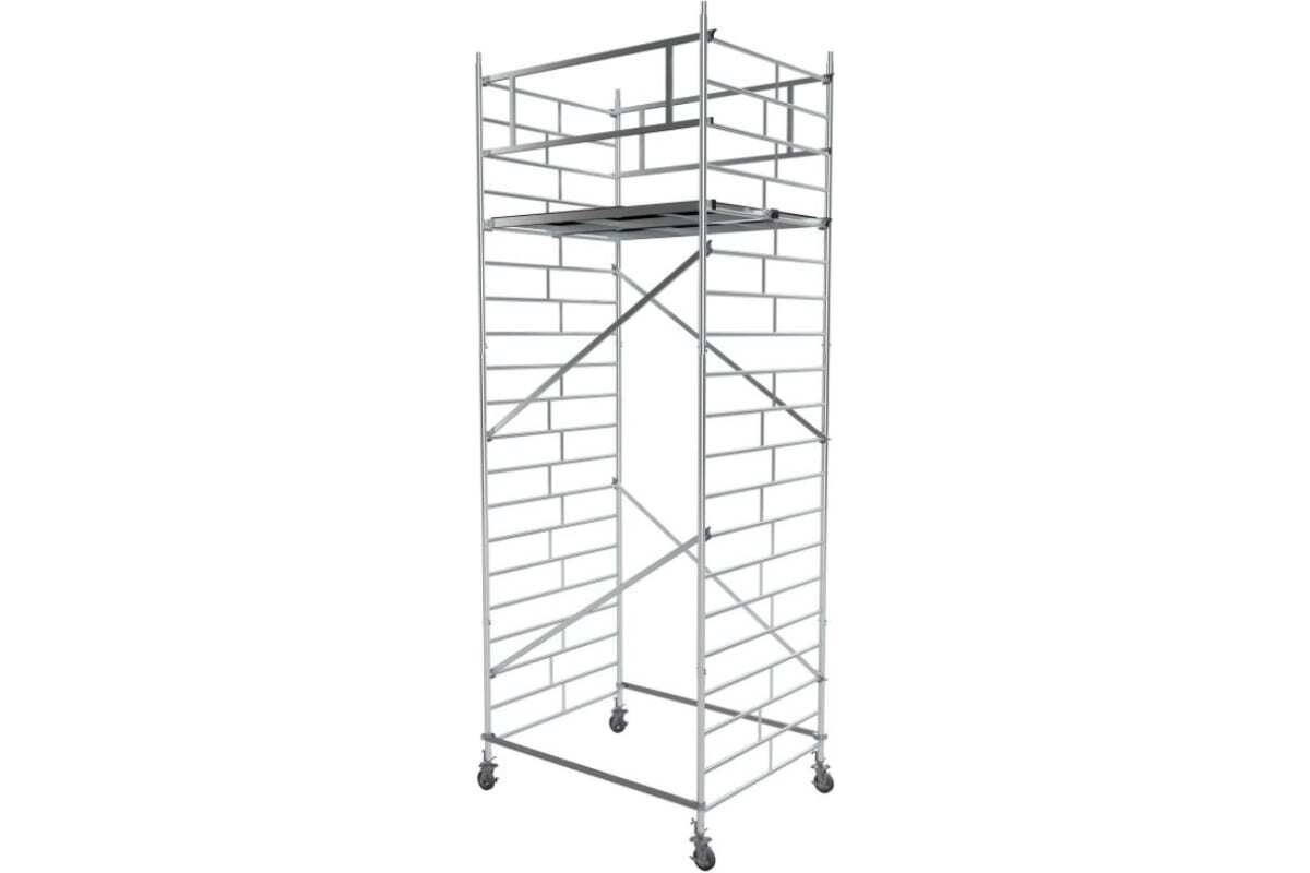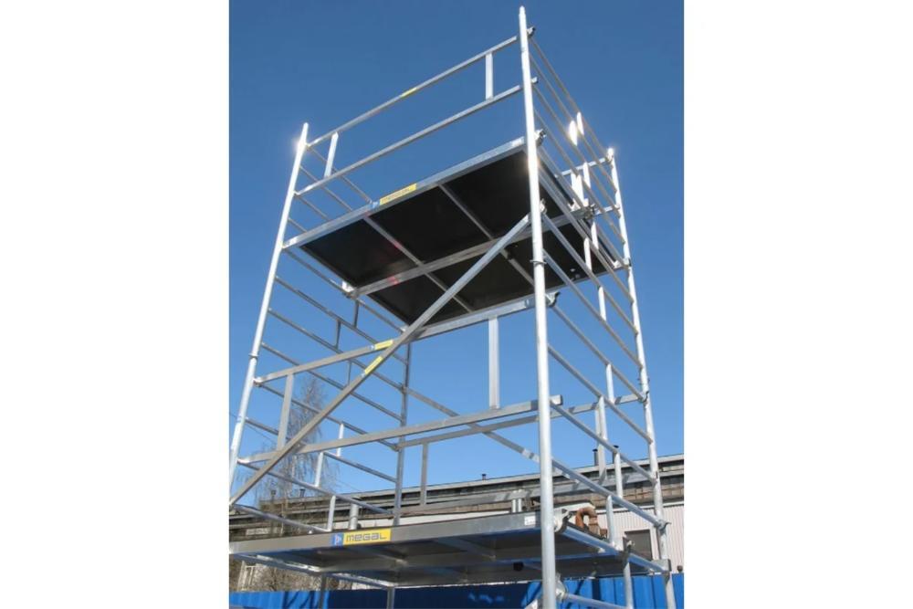 Вышка модульная алюминиевая MEGAL ВМА 1400/6 предназначена для организации рабочего места на высоте с использованием лестничных маршей в строительно-монтажных, ремонтных и прочих работах. Вышка собирается из двухметровых и метровых вертикальных рам. Рамы стыкуются между собой и фиксируются крепежными скобами. Все ступени рам выполнены из рифленого профиля, что обеспечивает безопасный подъем. Используются диагональные и горизонтальные связи (стяжки). Рабочий настил размером 2,0 х 1,4 м с люком. Вышка монтируется на компактном основании из стальных стяжек. Мобильность вышки достигается за счет поворотных колес со стопорами. Колеса регулируются по высоте в рамках длины винтовой опоры.