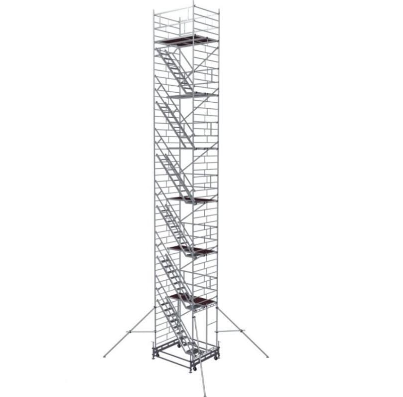 Вышка модульная алюминиевая MEGAL ВМА 1400Л/14 предназначена для организации рабочего места на высоте в строительно-монтажных, ремонтных и прочих работах. Сборка вышки производится без использования инструментов за счет наличия замкового крепления элементов. Вышка собирается из двухметровых и метровых вертикальных рам. Рамы стыкуются между собой и фиксируются крепежными скобами. Площадки соединяются наклонными лестничными маршами с рифлеными широкими ступенями, что обеспечивает комфортный подъем. Каждый марш оснащен перилами-ограждениями для безопасности. Монтируется на усиленном основании из двойной траверсы. Рабочая площадка размером 2,0 х 1,4 м позволяет с удобством расположиться четырем рабочим с инструментом. Высокая грузоподъемность обеспечивается за счет использования труб и профилей со стенкой не менее 2,5мм. Вышка имеет легкий вес за счет использования алюминиевых сплавов. Компенсация неровной поверхности возможна за счет регулирования вышки по высоте с помощью винтовых опор. Наличие поворотных колес со стопорами обеспечивает мобильность вышки.