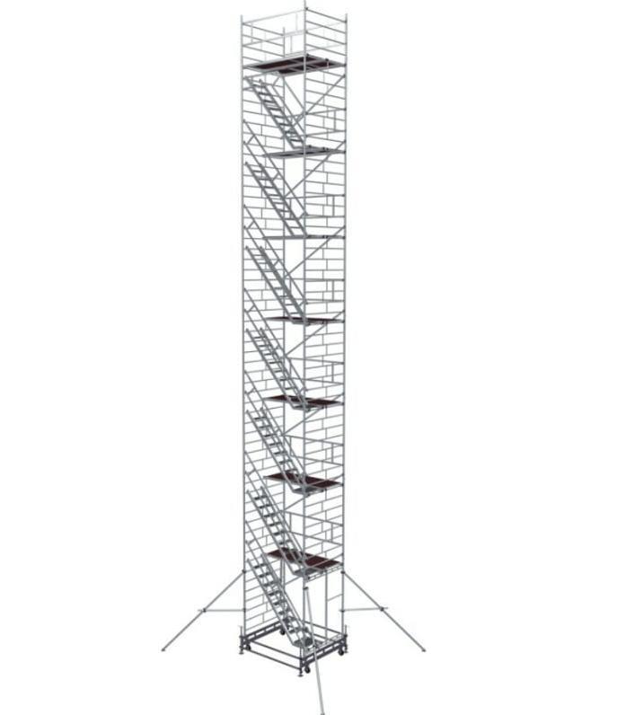 Вышка модульная алюминиевая MEGAL ВМА 1400Л/16 предназначена для организации рабочего места на высоте в строительно-монтажных, ремонтных и прочих работах. Сборка вышки производится без использования инструментов за счет наличия замкового крепления элементов. Вышка собирается из двухметровых и метровых вертикальных рам. Рамы стыкуются между собой и фиксируются крепежными скобами. Площадки соединяются наклонными лестничными маршами с рифлеными широкими ступенями, что обеспечивает комфортный подъем. Каждый марш оснащен перилами-ограждениями для безопасности. Монтируется на усиленном основании из двойной траверсы. Рабочая площадка размером 2,0 х 1,4 м позволяет с удобством расположиться четырем рабочим с инструментом. Высокая грузоподъемность обеспечивается за счет использования труб и профилей со стенкой не менее 2,5мм. Вышка имеет легкий вес за счет использования алюминиевых сплавов. Компенсация неровной поверхности возможна за счет регулирования вышки по высоте с помощью винтовых опор. Наличие поворотных колес со стопорами обеспечивает мобильность вышки.