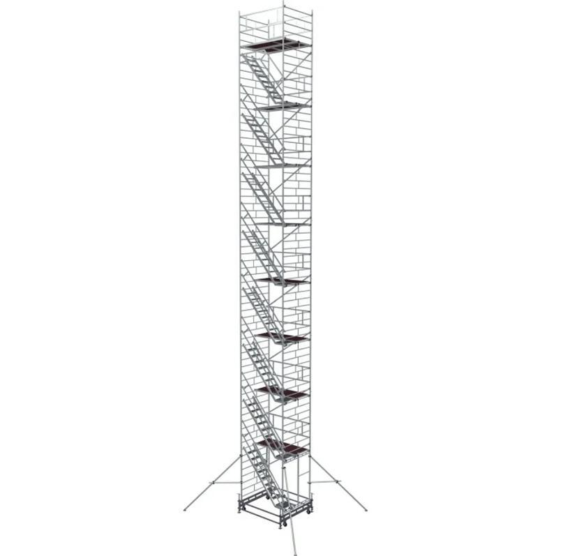 Вышка модульная алюминиевая MEGAL ВМА 1400Л/18 предназначена для организации рабочего места на высоте в строительно-монтажных, ремонтных и прочих работах. Сборка вышки производится без использования инструментов за счет наличия замкового крепления элементов. Вышка собирается из двухметровых и метровых вертикальных рам. Рамы стыкуются между собой и фиксируются крепежными скобами. Площадки соединяются наклонными лестничными маршами с рифлеными широкими ступенями, что обеспечивает комфортный подъем. Каждый марш оснащен перилами-ограждениями для безопасности. Монтируется на усиленном основании из двойной траверсы. Рабочая площадка размером 2,0 х 1,4 м позволяет с удобством расположиться четырем рабочим с инструментом. Высокая грузоподъемность обеспечивается за счет использования труб и профилей со стенкой не менее 2,5мм. Вышка имеет легкий вес за счет использования алюминиевых сплавов. Компенсация неровной поверхности возможна за счет регулирования вышки по высоте с помощью винтовых опор. Наличие поворотных колес со стопорами обеспечивает мобильность вышки.