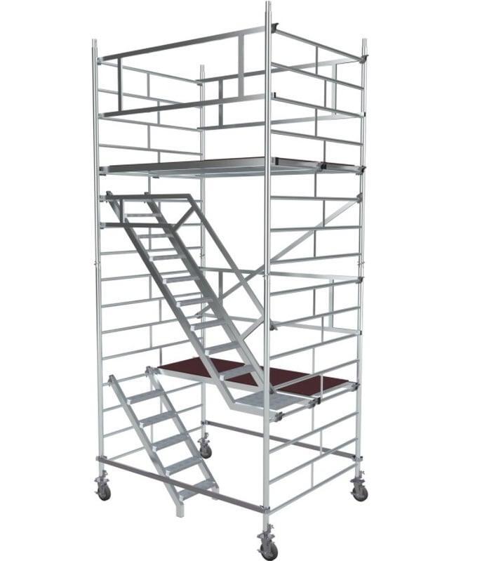 Вышка модульная алюминиевая MEGAL ВМА 1400Л/5 предназначена для организации рабочего места на высоте в строительно-монтажных, ремонтных и прочих работах. Сборка вышки производится без использования инструментов за счет наличия замкового крепления элементов. Вышка собирается из двухметровых и метровых вертикальных рам. Рамы стыкуются между собой и фиксируются крепежными скобами. Площадки соединяются наклонными лестничными маршами с рифлеными широкими ступенями, что обеспечивает комфортный подъем. Каждый марш оснащен перилами-ограждениями для безопасности. Монтируется на компактном основании из стальных стяжек. Рабочая площадка размером 2,0 х 1,4 м позволяет с удобством расположиться четырем рабочим с инструментом. Высокая грузоподъемность обеспечивается за счет использования труб и профилей со стенкой не менее 2,5мм. Вышка имеет легкий вес за счет использования алюминиевых сплавов. Компенсация неровной поверхности возможна за счет регулирования вышки по высоте с помощью винтовых опор. Наличие поворотных колес со стопорами обеспечивает мобильность вышки.
