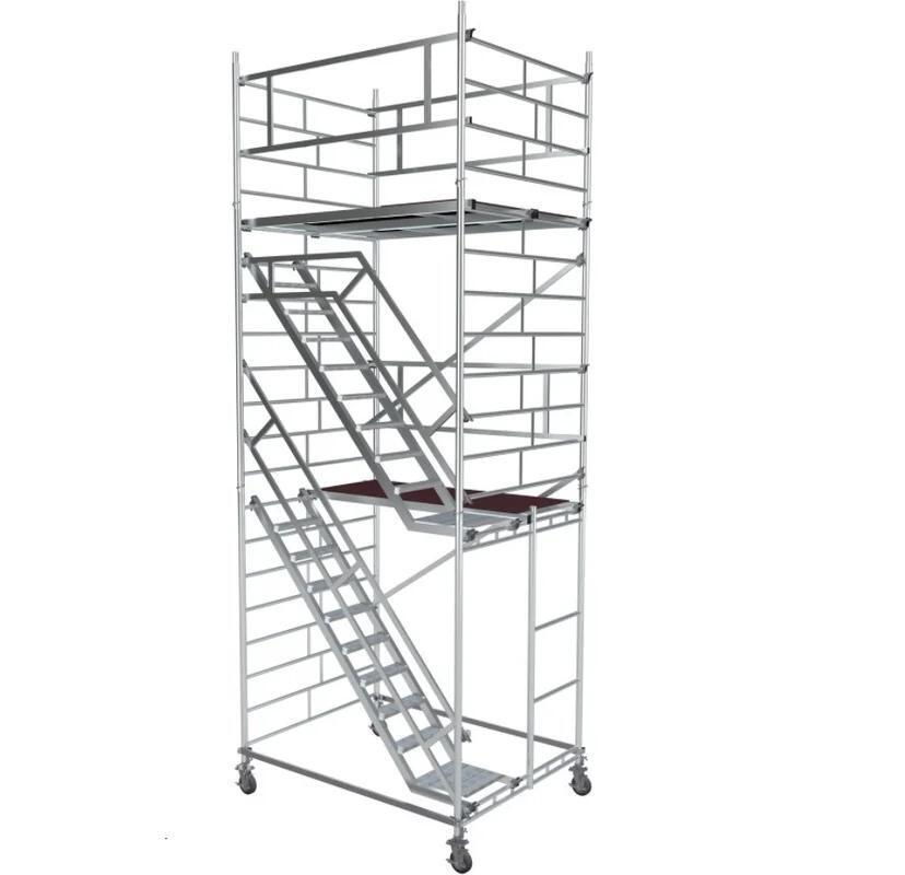 Вышка модульная алюминиевая MEGAL ВМА 1400Л/6 предназначена для организации рабочего места на высоте в строительно-монтажных, ремонтных и прочих работах. Сборка вышки производится без использования инструментов за счет наличия замкового крепления элементов. Вышка собирается из двухметровых и метровых вертикальных рам. Рамы стыкуются между собой и фиксируются крепежными скобами. Площадки соединяются наклонными лестничными маршами с рифлеными широкими ступенями, что обеспечивает комфортный подъем. Каждый марш оснащен перилами-ограждениями для безопасности. Монтируется на компактном основании из стальных стяжек. Рабочая площадка размером 2,0 х 1,4 м позволяет с удобством расположиться четырем рабочим с инструментом. Высокая грузоподъемность обеспечивается за счет использования труб и профилей со стенкой не менее 2,5мм. Вышка имеет легкий вес за счет использования алюминиевых сплавов. Компенсация неровной поверхности возможна за счет регулирования вышки по высоте с помощью винтовых опор. Наличие поворотных колес со стопорами обеспечивает мобильность вышки.