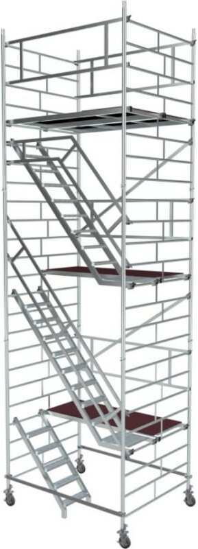 Вышка модульная алюминиевая MEGAL ВМА 1400Л/7 предназначена для организации рабочего места на высоте в строительно-монтажных, ремонтных и прочих работах. Сборка вышки производится без использования инструментов за счет наличия замкового крепления элементов. Вышка собирается из двухметровых и метровых вертикальных рам. Рамы стыкуются между собой и фиксируются крепежными скобами. Площадки соединяются наклонными лестничными маршами с рифлеными широкими ступенями, что обеспечивает комфортный подъем. Каждый марш оснащен перилами-ограждениями для безопасности. Монтируется на компактном основании из стальных стяжек. Рабочая площадка размером 2,0 х 1,4 м позволяет с удобством расположиться четырем рабочим с инструментом. Высокая грузоподъемность обеспечивается за счет использования труб и профилей со стенкой не менее 2,5мм. Вышка имеет легкий вес за счет использования алюминиевых сплавов. Компенсация неровной поверхности возможна за счет регулирования вышки по высоте с помощью винтовых опор. Наличие поворотных колес со стопорами обеспечивает мобильность вышки.