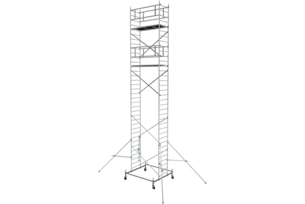 Вышка модульная алюминиевая MEGAL ВМА 700/10 предназначена для организации рабочего места на высоте с использованием лестничных маршей в строительно-монтажных, ремонтных и прочих работах. Вышка собирается из двухметровых и метровых вертикальных рам. Рамы стыкуются между собой и фиксируются крепежными скобами. Все ступени рам выполнены из рифленого профиля, что обеспечивает безопасный подъем. Используются диагональные и горизонтальные связи (стяжки). Рабочая площадка размером 2,0 х 0,7м с люком. Монтируется на усиленном основании из двойной траверсы с колесами. Мобильность вышки достигается за счет поворотных колес со стопорами. Компенсация неровной поверхности возможна за счет наличия винтовых опор, регулируемых высоте.