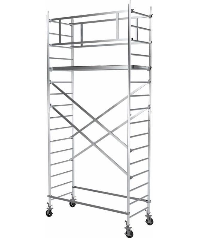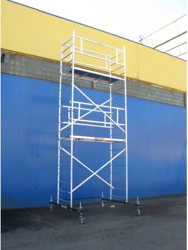 Вышка модульная алюминиевая MEGAL ВМА 700/5 используется для организации рабочего места на высоте в строительно-монтажных, ремонтных и прочих работах. Вышка собирается из двухметровых и метровых вертикальных рам. Рамы стыкуются между собой и фиксируются крепежными скобами. Все ступени рам выполнены из рифленого профиля. Для придания жесткости конструкции используются диагональные и горизонтальные связи (стяжки). Рабочая площадка размером 2,0 х 0,7м с люком. Вышка оснащена поворотными колесами со стопорами. Колеса регулируются по высоте в рамках длины винтовой опоры. Высокая грузоподъемность обеспечивается за счет использования труб и профилей со стенкой не менее 2,5мм.
