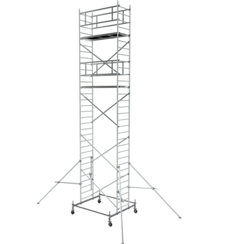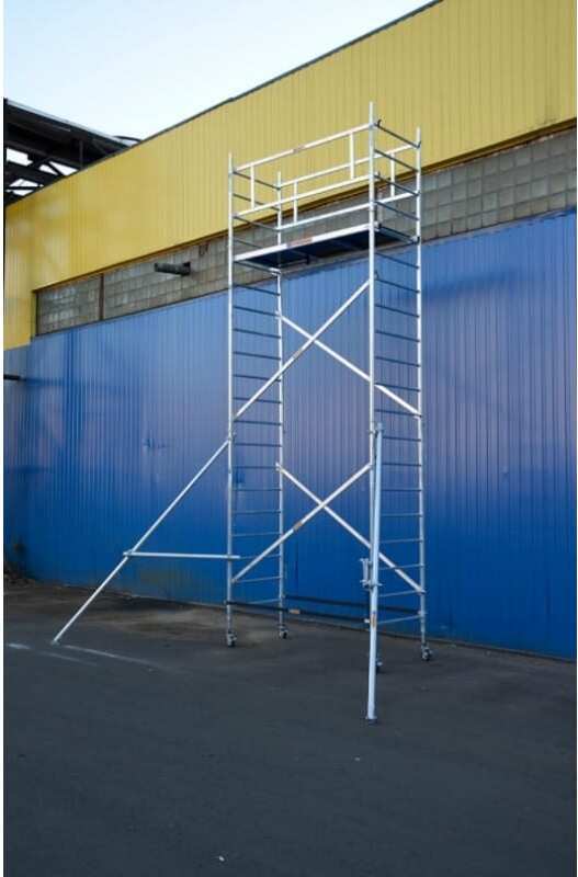 Вышка модульная алюминиевая MEGAL ВМА 700/9 используется для организации рабочего места на высоте в строительно-монтажных, ремонтных и прочих работах. Вышка собирается из двухметровых и метровых вертикальных рам. Рамы стыкуются между собой и фиксируются крепежными скобами. Все ступени рам выполнены из рифленого профиля. Для придания жесткости конструкции используются диагональные и горизонтальные связи (стяжки). Рабочая площадка размером 2,0 х 0,7м с люком. Вышка оснащена поворотными колесами со стопорами. Колеса регулируются по высоте в рамках длины винтовой опоры. Высокая грузоподъемность обеспечивается за счет использования труб и профилей со стенкой не менее 2,5мм.