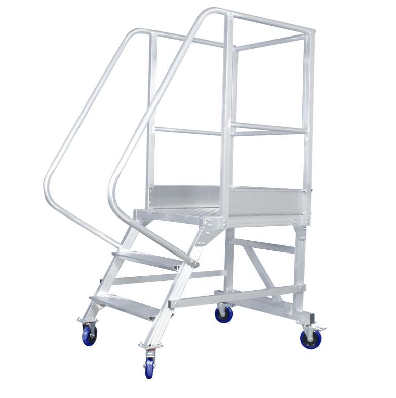 Вышка - стремянка разборная на колесах (150 кг) MEGAL ВС-0.8 предназначена для работ в торговых залах, на складах, вдоль стеллажей и других объектов, при проведении ремонтных, монтажных и иных работ на возвышении. Лестница имеет легкий вес за счет использования алюминиевых сплавов. Трехстороннее ограждение площадки со встроенной защитной планкой в районе колен, бортовое ограждение, перила по всей длине лестничного марша, ступени глубиной 160мм обеспечивают безопасный подъем, спуск и проведение работ. Площадка размером 800х680мм позволяет удобно расположиться рабочему с необходимым инструментом. Небольшая занимаемая площадь и прочные поворотные колеса со стопорами позволяют легко маневрировать в ограниченном пространстве. Легкий монтаж без специального инструмента сокращают время подготовки оборудования к работе.