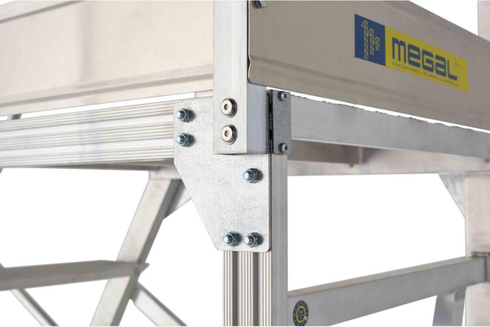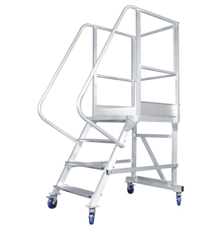 Вышка - стремянка разборная на колесах (150 кг) MEGAL ВС-1.0 предназначена для работ в торговых залах, на складах, вдоль стеллажей и других объектов, при проведении ремонтных, монтажных и иных работ на возвышении. Лестница имеет легкий вес за счет использования алюминиевых сплавов. Трехстороннее ограждение площадки со встроенной защитной планкой в районе колен, бортовое ограждение, перила по всей длине лестничного марша, ступени глубиной 160мм обеспечивают безопасный подъем, спуск и проведение работ. Площадка размером 800х680мм позволяет удобно расположиться рабочему с необходимым инструментом. Небольшая занимаемая площадь и прочные поворотные колеса со стопорами позволяют легко маневрировать в ограниченном пространстве. Легкий монтаж без специального инструмента сокращают время подготовки оборудования к работе.