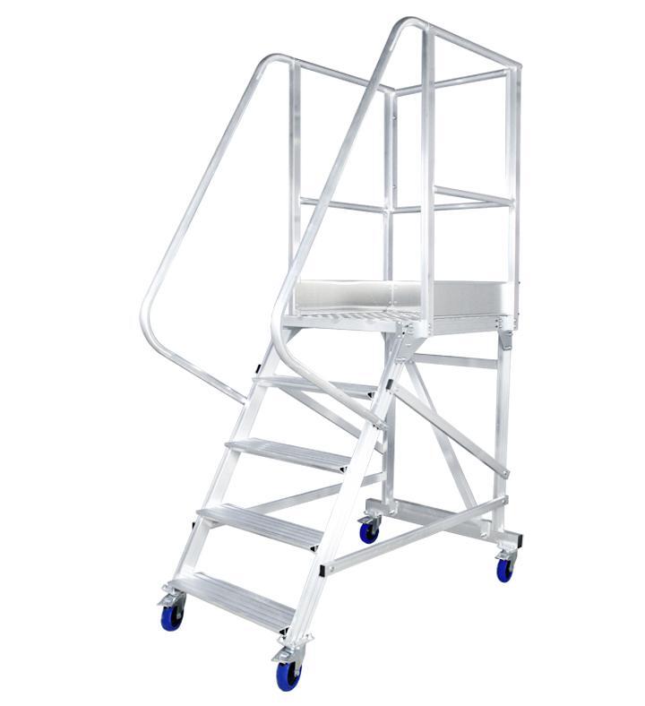 Вышка - стремянка разборная на колесах (150 кг) MEGAL ВС-1.2 предназначена для работ в торговых залах, на складах, вдоль стеллажей и других объектов, при проведении ремонтных, монтажных и иных работ на возвышении. Лестница имеет легкий вес за счет использования алюминиевых сплавов. Трехстороннее ограждение площадки со встроенной защитной планкой в районе колен, бортовое ограждение, перила по всей длине лестничного марша, ступени глубиной 160мм обеспечивают безопасный подъем, спуск и проведение работ. Площадка размером 800х680мм позволяет удобно расположиться рабочему с необходимым инструментом. Небольшая занимаемая площадь и прочные поворотные колеса со стопорами позволяют легко маневрировать в ограниченном пространстве. Легкий монтаж без специального инструмента сокращают время подготовки оборудования к работе.