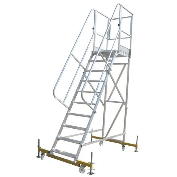 Вышка - стремянка разборная на колесах (150кг+150кг) MEGAL ВС2-2.5 предназначена для работ в торговых залах, на складах, вдоль стеллажей и других объектов, при проведении ремонтных, монтажных и иных работ на высоте. Представляет собой безопасную и легкую конструкцию из алюминиевых профилей высокой прочности. Имеет безопасные противоскользящие ступени из специального рифленого профиля. Площадка размером 800х680мм позволяет удобно расположиться рабочему с необходимым инструментом. Трехстороннее ограждение площадки со встроенной защитной планкой в районе колен, бортовое ограждение, перила по всей длине лестничного марша, ступени глубиной 160мм обеспечивают безопасный подъем, спуск и проведение работ, что подтверждает полное соответствие требованиям по ГОСТ. Все соединительные узлы и элементы полностью безопасны, обработаны и одобрены службой контроля качества. Простая и быстрая сборка лестницы без специального инструмента и поставка в виде предварительно собранных узлов сокращают время подготовки оборудования MEGAL к работе. Максимальный срок службы достигнут благодаря коррозионностойким свойствам алюминиевых сплавов. Небольшая занимаемая площадь и прочные поворотные колеса со стопорами позволяют легко маневрировать в ограниченном пространстве.