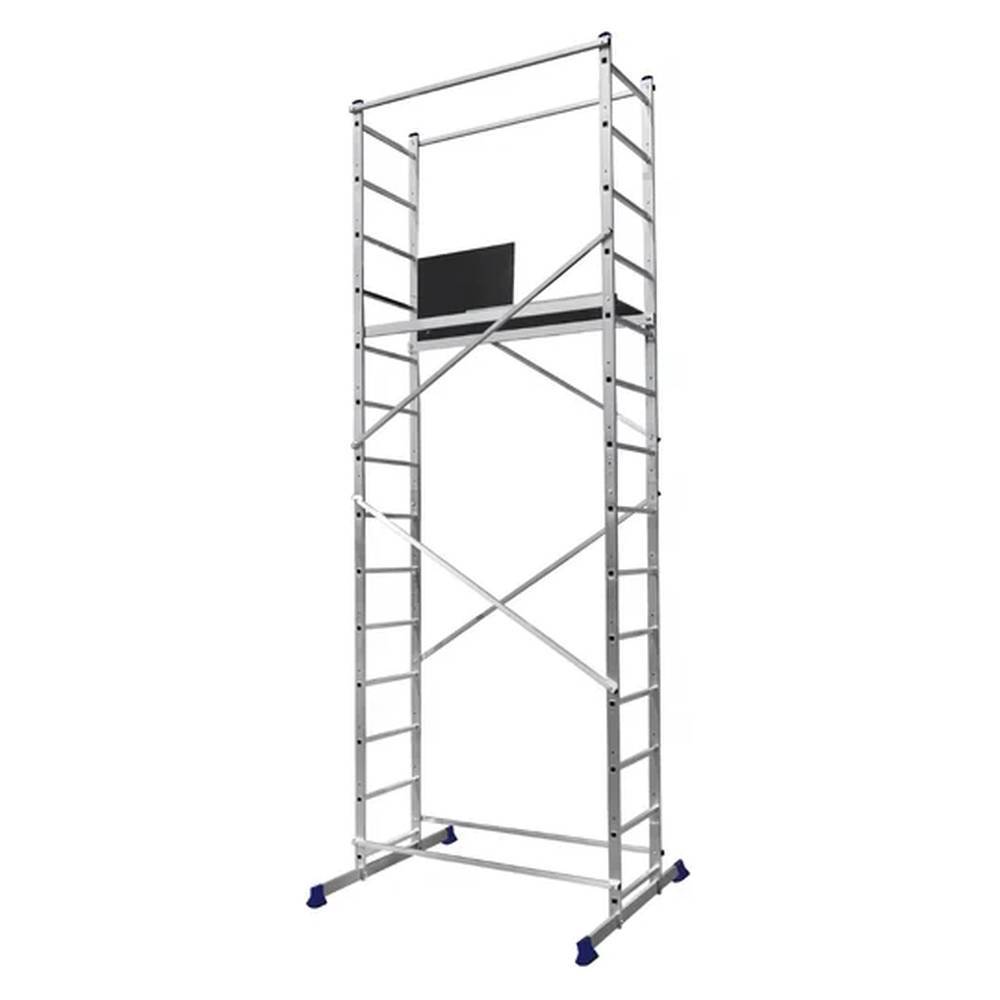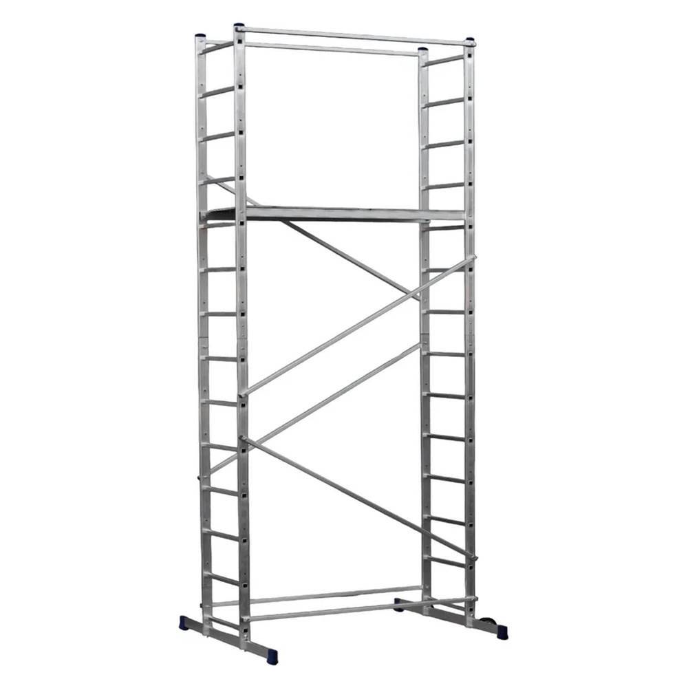 Вышка-тура алюминиевая Алюмет 2х8 ступеней (ВТ81608020) серии «Техно»- представляет собой пространственную сборно-разборную алюминиевую конструкцию башенного типа, состоящую из рам (боковых секций), соединенных между собой горизонтальными и диагональными перекладинами, и имеющую рабочий настил из нескользящей ламинированной влагостойкой фанеры. Вышка-тура изготовлена из высокопрочного алюминиевого сплава, в соответствии с требованиями ГОСТ 22233. Ступени имеют противоскользящую поверхность. Верхние горизонтальные перекладины так же являются ограждением рабочей зоны. Боковые секции выполнены в виде лестниц. В комплект входят колеса, служащие для передвижения вышки. Внизу на концах секций закреплены стабилизаторы, обеспечивающие хорошую устойчивость и предотвращающие возможность опрокидывания вышки. Вышка-тура серия «Техно» применяется для выполнения отделочных и ремонтных работ как снаружи, так и внутри помещений.