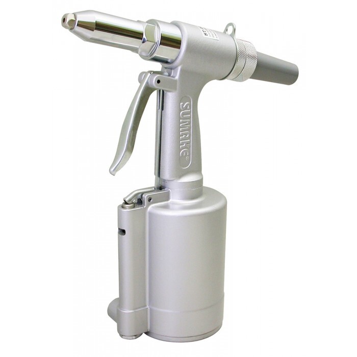 Пневмозаклепочник Sumake ST-6615 универсальный, простой и удобный в эксплуатации инструмент с силой удара 720 Дж. Оснащен надежным пневмодвигателем, который отличается долгим сроком службы. Используется для установки вытяжных, резьбовых заклепок, резьбовых шпилек. Размер заклепок: 2,4; 3,2; 4; 4,8 мм. Расход воздуха 60 л/мин. Расход воздуха на один удар 1,14 л/удар. Диаметр воздушного штуцера 1/4F дюйм. Рабочее давление 7 бар. Малый вес инструмента - 1,5 кг, позволяет экономить силы оператора при длительных и интенсивных рабочих нагрузках.