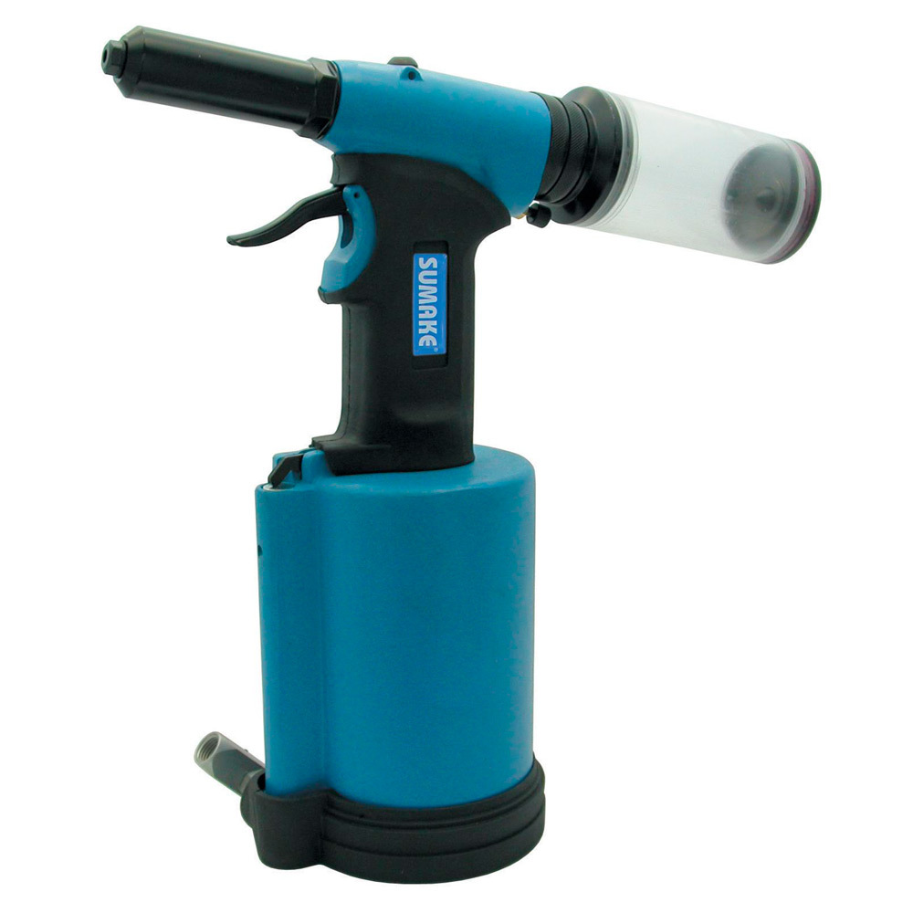 Пневмозаклепочник вакуумного типа Sumake ST-6677 с тяговым усилием 1700 кг, имеет прочную и надежную конструкцию, удобен и прост в эксплуатации. Давление 7 атм. Корпус выполнен из металла и защищает механизмы инструмента от внешних воздействий. Предназначен для скрепления материалов с помощью заклепок диаметрами: 3,2; 4,0; 4,8; 6,3; 7,0 мм. Заклепки из алюминия, меди, стали и нержавеющей стали. Расход воздуха на установку одной заклепки составляет 1 л/удар. Производительность пневмозаклепочника 60 л/мин. Тип соединения рапид (EURO). Диаметр воздушного штуцера 1/4F дюйм. Вес модели 1,7 кг.