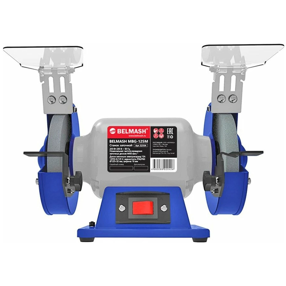 Заточной станок БЕЛМАШ MBG-125M предназначен для затачивания режущих инструментов при помощи вертикально вращающихся заточных дисков. Имеет классическую компоновку. По центру расположен асинхронный двигатель мощностью 250Вт. По обе стороны от двигателя установлены заточные диски диаметром 125мм и шириной 16мм с различной зернистостью. Оба диска оснащены рабочими упорами (подручниками), защитными кожухами (листовая сталь), искрозащитными экранами. На переднюю часть выведен выключатель. Имеются отверстия для крепления к верстаку.